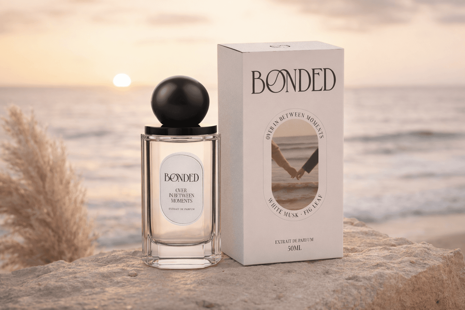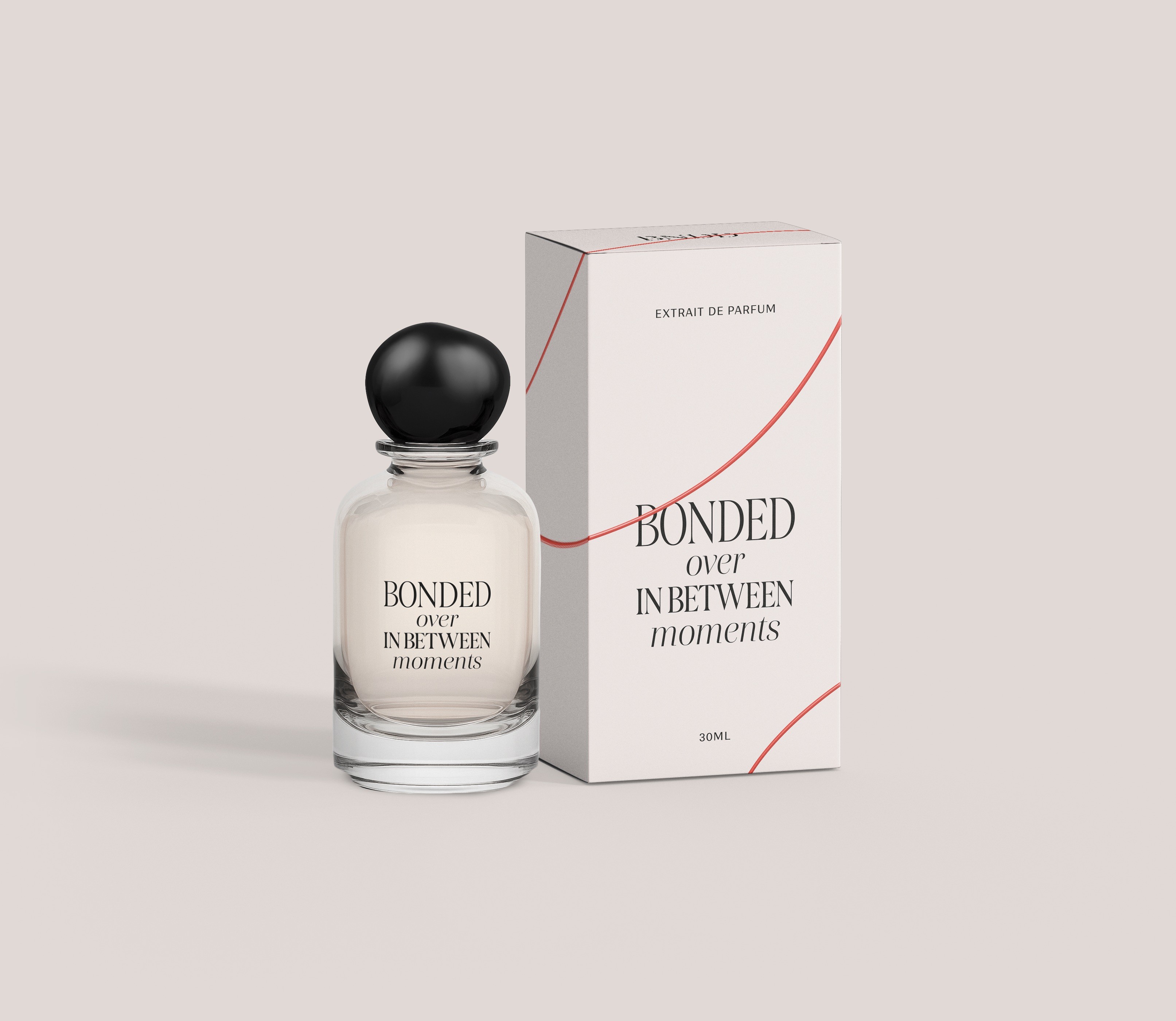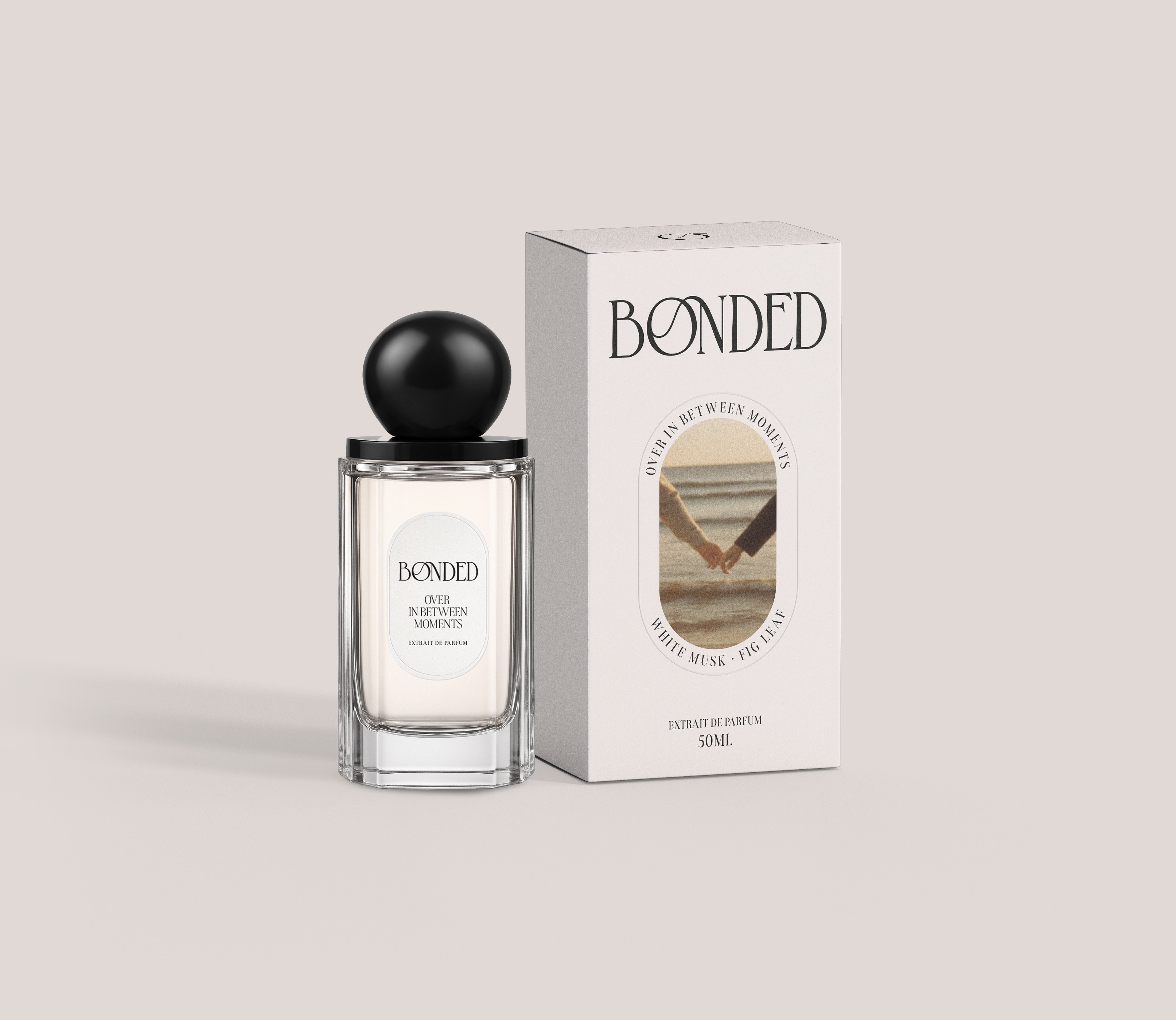 Bonded is a unisex niche fragrance concept built around the idea of human connection — the invisible bonds that form between people in shared moments. The project required packaging for three distinct scents, united by a common conceptual thread while maintaining individual character.